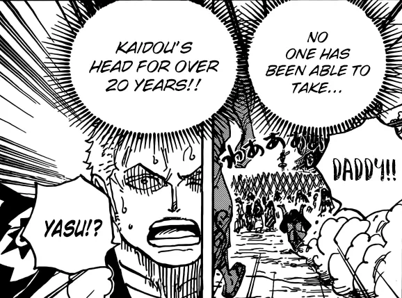 -Sadece Zoro'nun Enma'yı aldığı olaylardan biraz önce, Zoro, Yasuie'yi izlediği gibi Hiyori ile birliktedir (Bölüm 942), Kaido'nun rolünü üstlenecek eşsiz bir diyalog yerleştirme vardır. Yasui’nin ölümünü izleyen kasaba halkı, 20 yıl içinde hiç kimsenin “ Kaido’nun kafasını alabileceğini” yorumladı.diyalog “ Kaido’nun kafasını” sadece Zoro gösteren bir panele yerleştirilir. Bu tüm ark, Oden'in korkunç ölümünden 20 yıl sonra gelecek olan bu altın anı için bekleyen tüm çabayla ilgilidir.Yine, Zoro'nun Hiyori ile olan bağlantısıyla (ve Yasui'nin ölümünde gösterdiği öfke) Zoro'yu asla bir hikaye yay çatışmasına bu kadar yakın görmemiştik. Orochi, Yasuie'yi sadece güç ve güvenlik ağı Kaido'nun onu sağladığı için öldürebilirdi. Oden flaşında öğrendiği gibi, Orochi’den kurtulmanız için Kaido’yu yenmeniz gerekir. Avenge Oden ve Yasuie'ye ve Orochi'yi almak için Kaido'nun dışarı çıkarılması gerekiyor