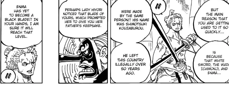 - Enma'yı aldıktan sonra,Hitetsu, Zoro'ya insanların onu kullanmaya hazır olduğunu ve Zoro'yu kullanmaya çalıştığını söyledi, kılıcın tam siyah bir bıçak haline gelmesinden daha güçlü olabileceğini söyledi.Zoro, bıçaka alıştığı zaman, o çok daha güçlü olacak.Zoro ve Hitetsu'dan gelen yorumlar, Zoro'nun kılıcı ustalaştırarak ve daha önce hiç gitmediğinden çok daha uzağa gittiğini ima ediyor.Bütün siyah bir bıçak haline gelmesine neden oldu. Bu kılıç tam olarak kullanılmadan önce ne kadar gitti? Kaido yaralı, Kaido'yu yaralayan tek şey olduğunu söyledi. Oden'in kızı tarafından Oden'in intikamını taşıyan biri tarafından nasıl doğru bir şekilde ustalaşacak?