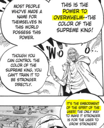 Haoshoku Haki hakkında en önemli bilgiler 597 bölümde Karanlık Kral'dan geldi. Rayleigh'in Haoshoku hakkında söylediği ilk şey,“İhteşme gücüdür – yüce kralın rengi”