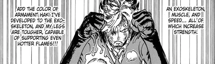 Bu bölümde Sanji, yeni exoskeleton yükseltmesi nedeniyle ve onun Armament'i eğittiğini söyledi, bacakları nihayet alevlerin ısısını idare edebilir. Bu, Sanji'nin uzun bir süre boyunca savaşabileceği anlamına gelir, sadece bacaklarının etkisini ve ısıyı idare edemeyeceği anlamına gelir.