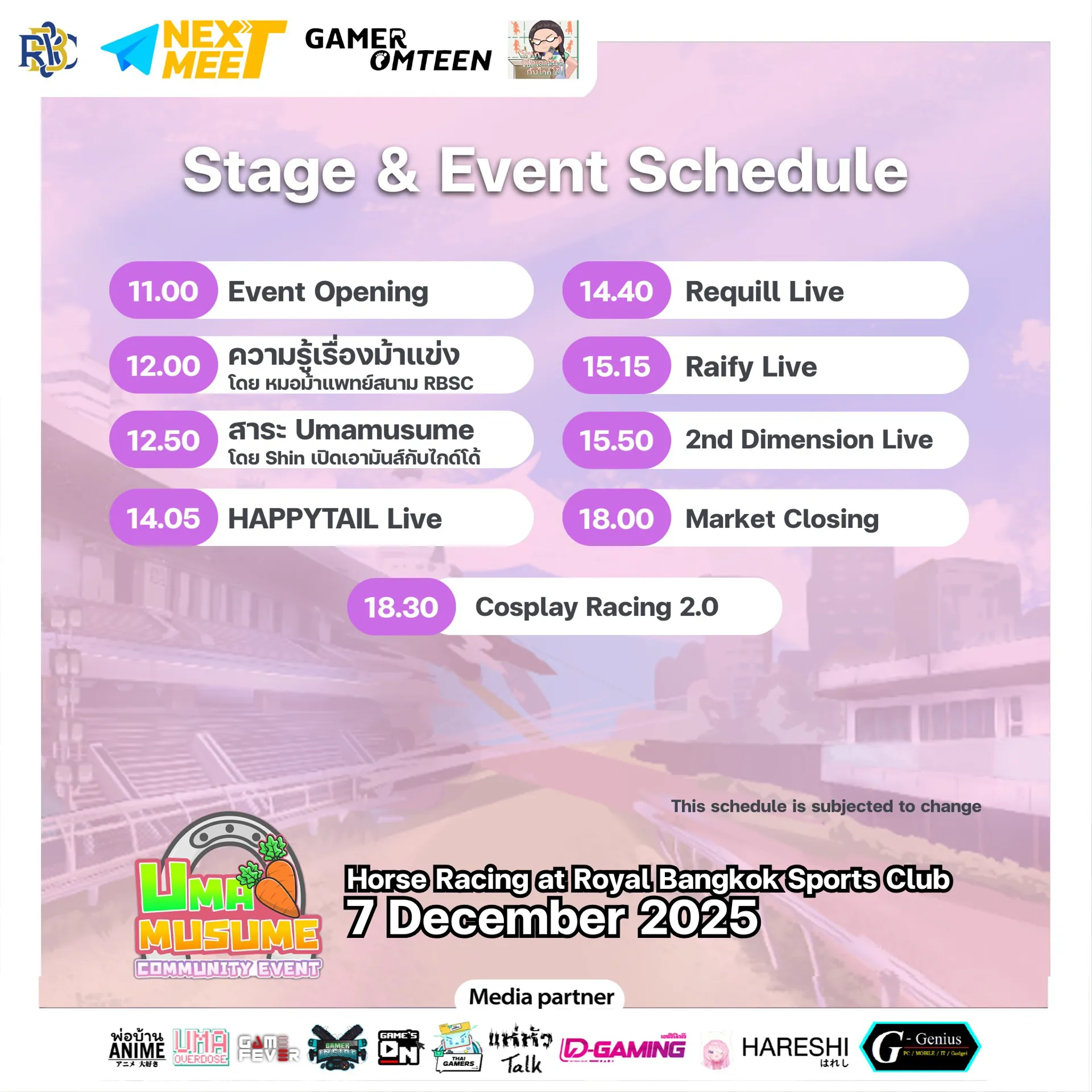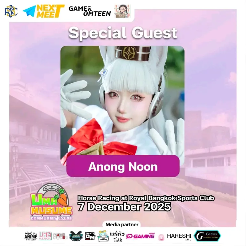 Eğer biriniz varsa Umamusume: Pretty Derby fan ve 7 Aralık'ta Bangkok'tasınız, Umamusume Topluluk Topluluğu Olay nerede olması gerektiğidir! Her şeyin bir kutlaması Umamusume At yarışı, olay, ülkenin en büyük at yarışının yanı sıra Royal Bangkok Sports Club'da gerçekleşecek, H.M. The King's Cup. Gün aktiviteleri yarışları cosplay edecek, idol buluşma-ve-greets, bir parach pazarı ve birkaç misafir görünümü!